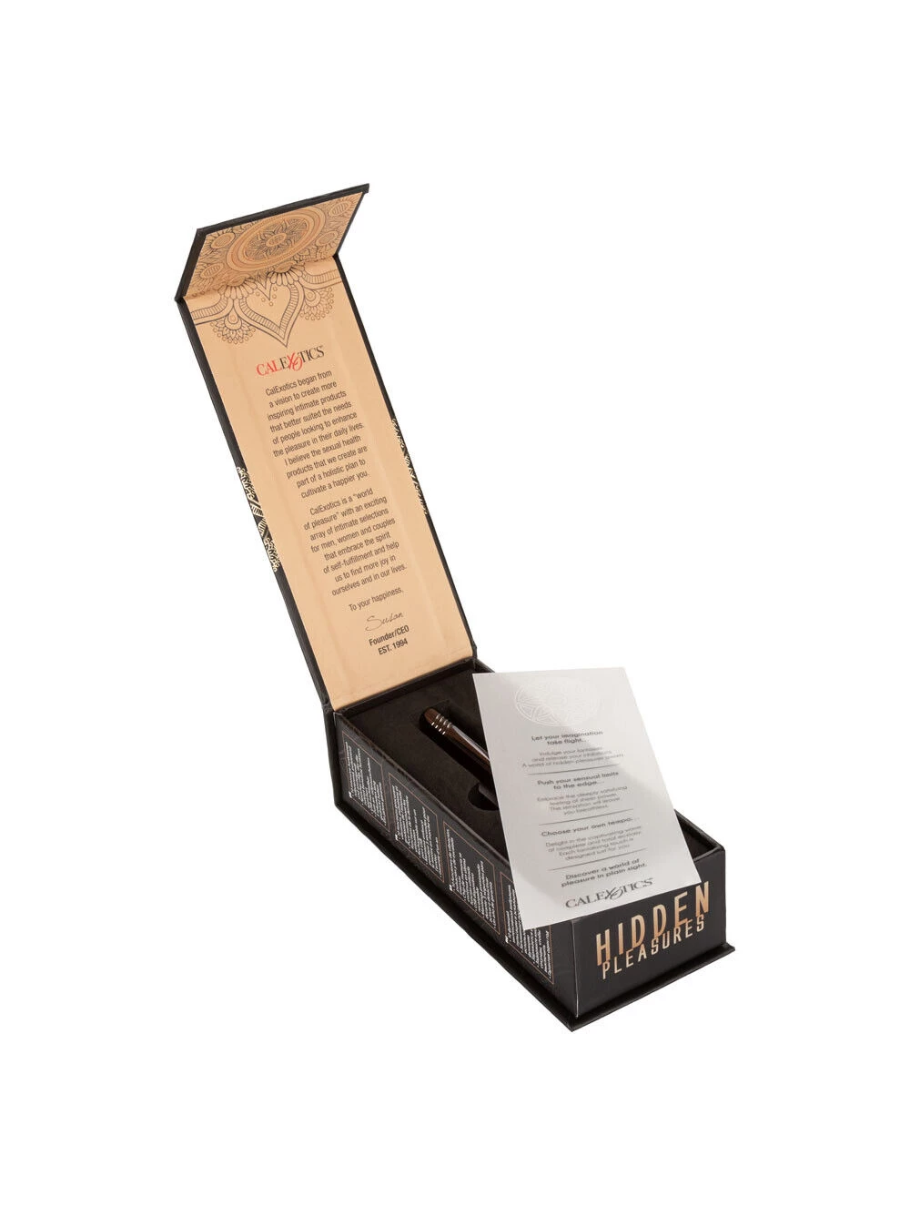 Go all out with the discreet bullet vibe that stands apart from the crowd, but doesn’t make a scene. Hidden Pleasures is a compact metallic vibrator that packs 10 rumbling functions into a very miniature frame. Indistinguishable from most household electronics, this rechargeable vibe knows how to keep a secret. The single touch controls allow you to effortlessly filter through 10 pulsating modes, while the whisper quiet motor keeps your playtime incognito.