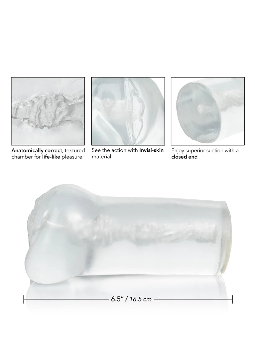 The indulgent stroker has a textured, anatomically correct chamber for explosive stimulation. Use this close-ended sleeve with ample lubrication for powerful suction worthy of your naughtiest fantasies. Invisi-Skin Thermoplastic Elastomer is a super-soft, ultra stretchy material with a unique, life-like feel delivering pure satisfaction in every stroke.