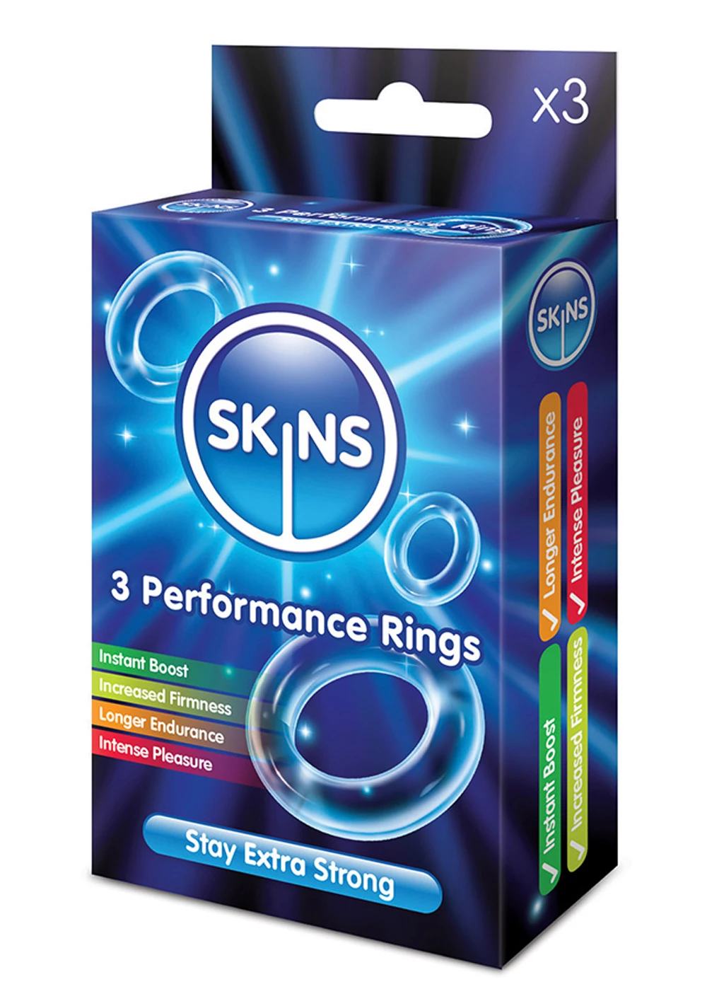 Skins Performance Rings – extra strong so you can go the extra mile. The instant boost you get from Skins Performance Rings will increase firmness, increase endurance and more intense pleasure. The ring is made of stretchy material which is easy to put on and take off, and fits firmly without constricting. Engineered for the perfect fit, the pleasure ring is also made of super soft material for comfort. Enjoy better sex with greater rewards!