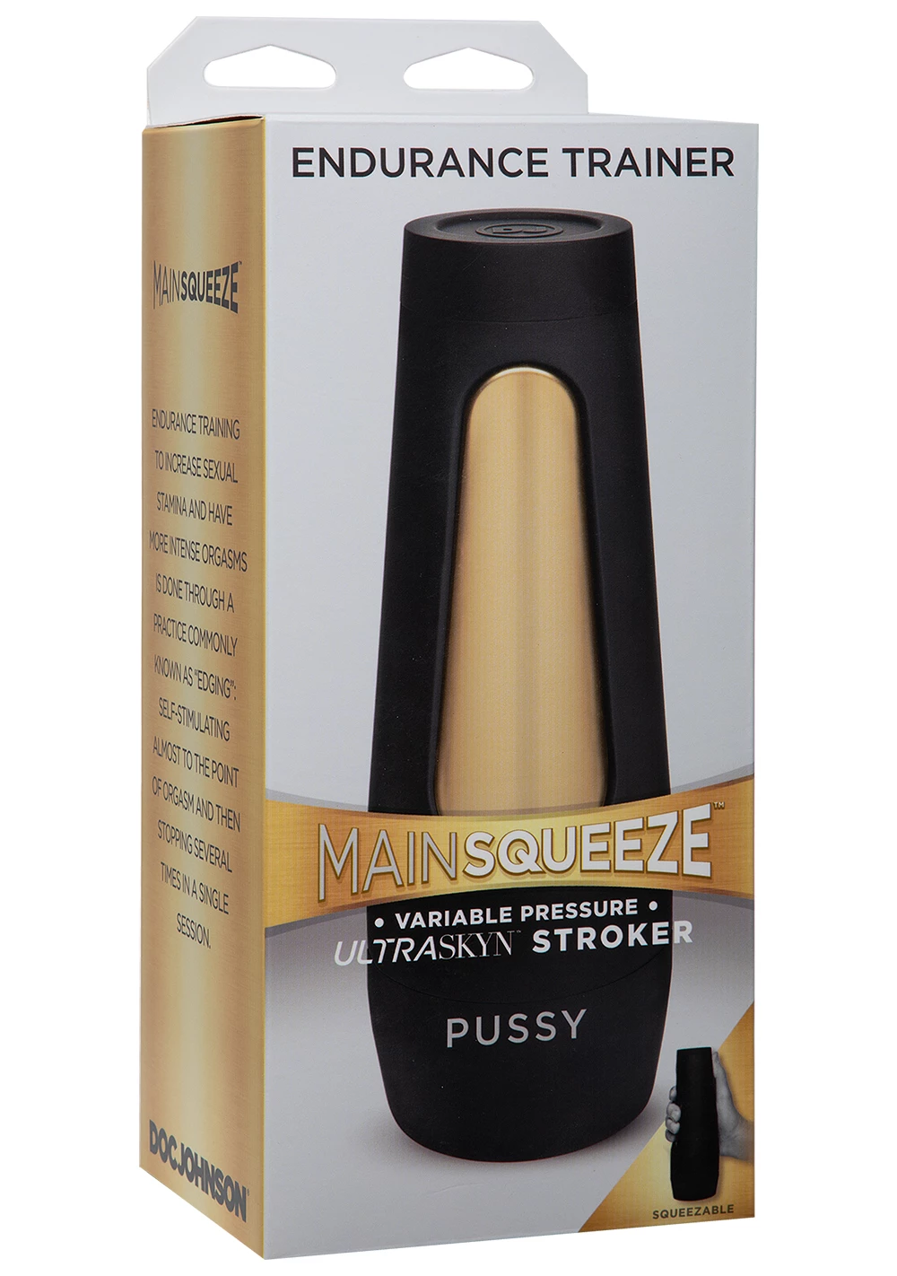 You can go the distance! Stamina training methods like edging have become standard as men everywhere learn to apply this technique for increased stamina and more powerful orgasms. Get in on the action with the Main Squeeze Endurance Trainer, a hard-case stroker with a built-in squeeze plate grip that allows the user to control the pressure. Featuring a realistic pussy opening and tight, textured interior in lifelike ULTRASKYN, the Endurance Trainer warms to body temperature with use and emulates the feel of real skin. This stroker’s end cap adjusts to perfectly customize the strength of the suction desired, and a screw-on top makes it easy to store safely and discreetly. Order now and start experiencing the sexual health benefits of endurance training today!