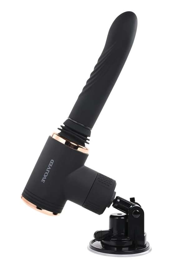 Sophisticated design meets ultimate satisfaction with this powerful machine that makes your pleasure its top priority! An adjustable suction cup mount gives you hands-free play like you’ve never experienced! Click the sleek silicone shaft into the main barrel and away you go – thrusting in 7 glorious speeds. Then unleash the vibrations for 7 speeds to rock your world – and don’t forget the heating function that warms you up from the inside! An elegant 3-button control panel allows access to each separate motor with ease, giving you the ride of a lifetime! And when it’s time to clean up, the shaft packs up into the long handle – and everything comes with a neat cap for storage. Rechargeable, splash-proof and easy to clean! 5 year warranty.