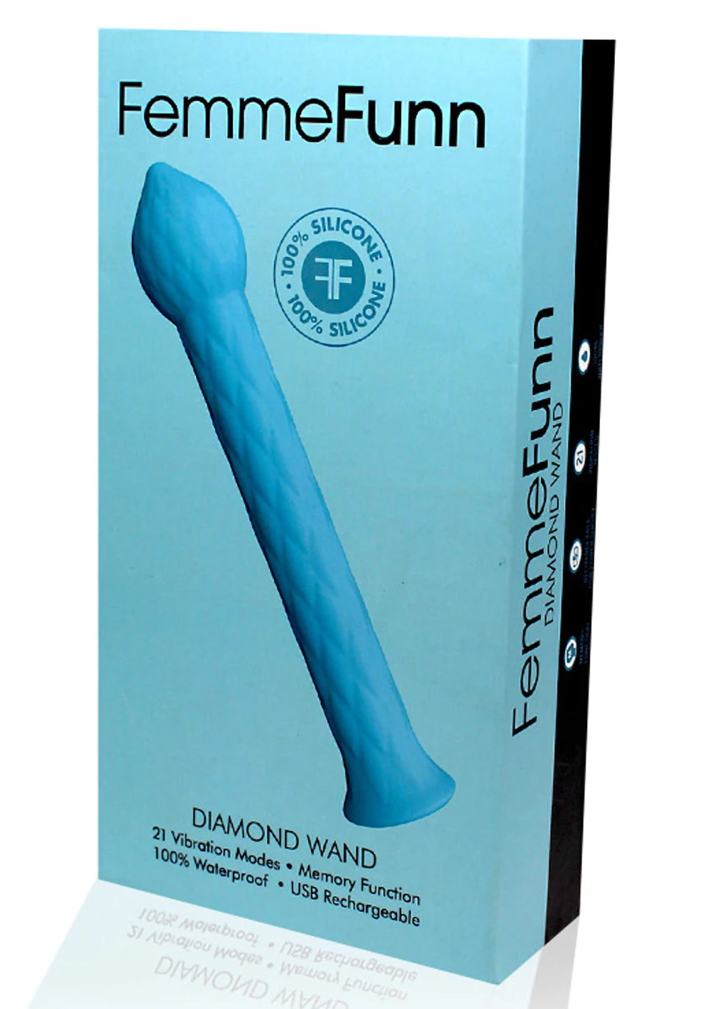The FemmeFunn Diamond Wand was built on 3 ideas: easy, powerful, and convenient to use. One button to push, 21 powerful settings of excitement, small, lightweight, and fully submersible. Silicone. Use time more than 3 hours.100% waterproof. USB rechargeable.
