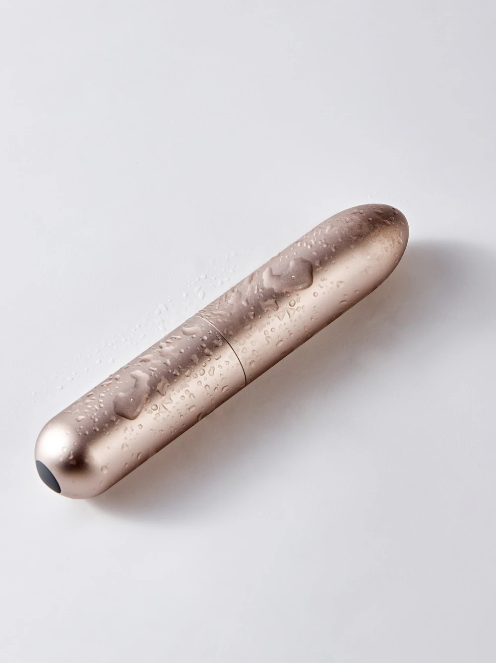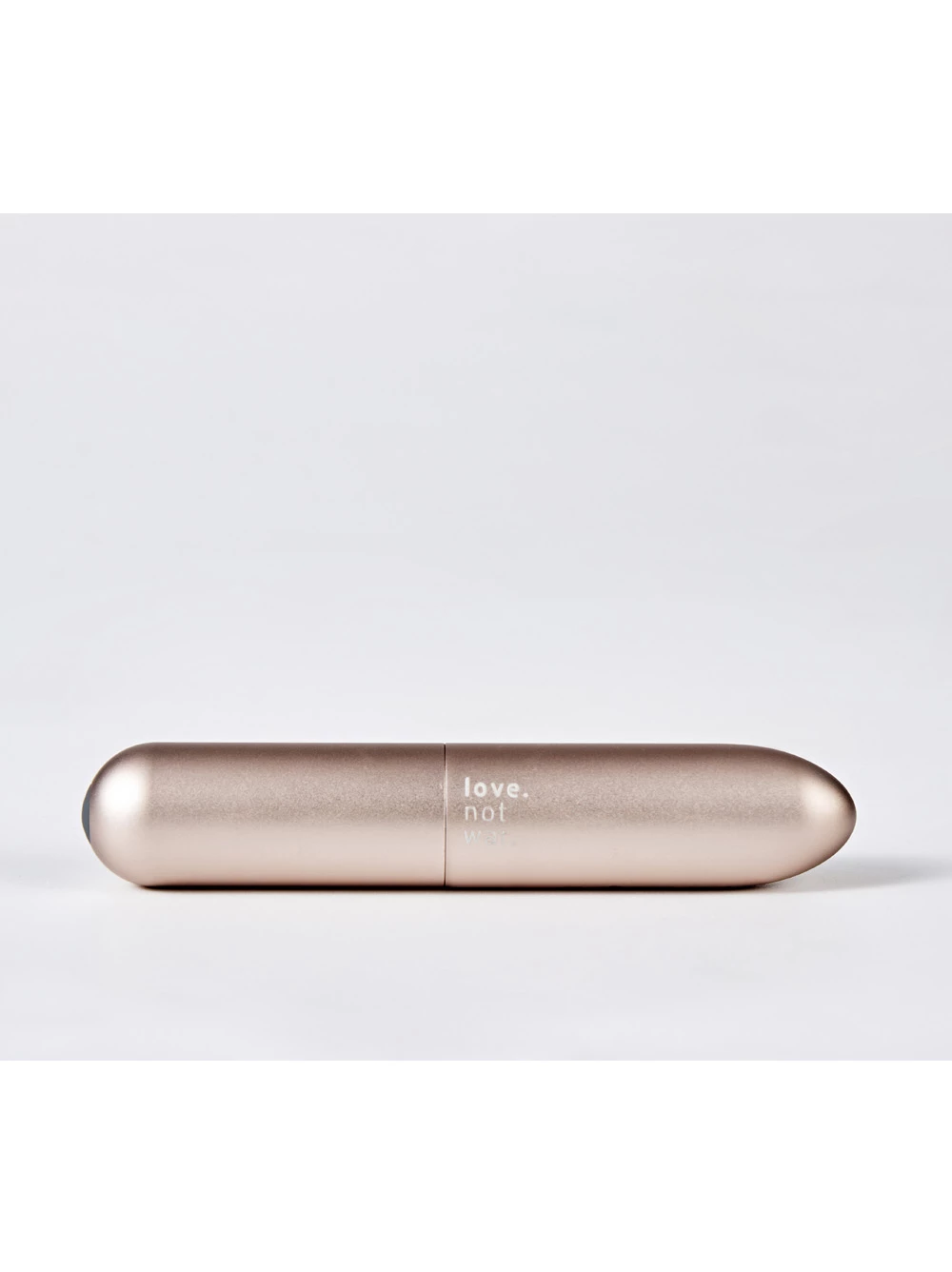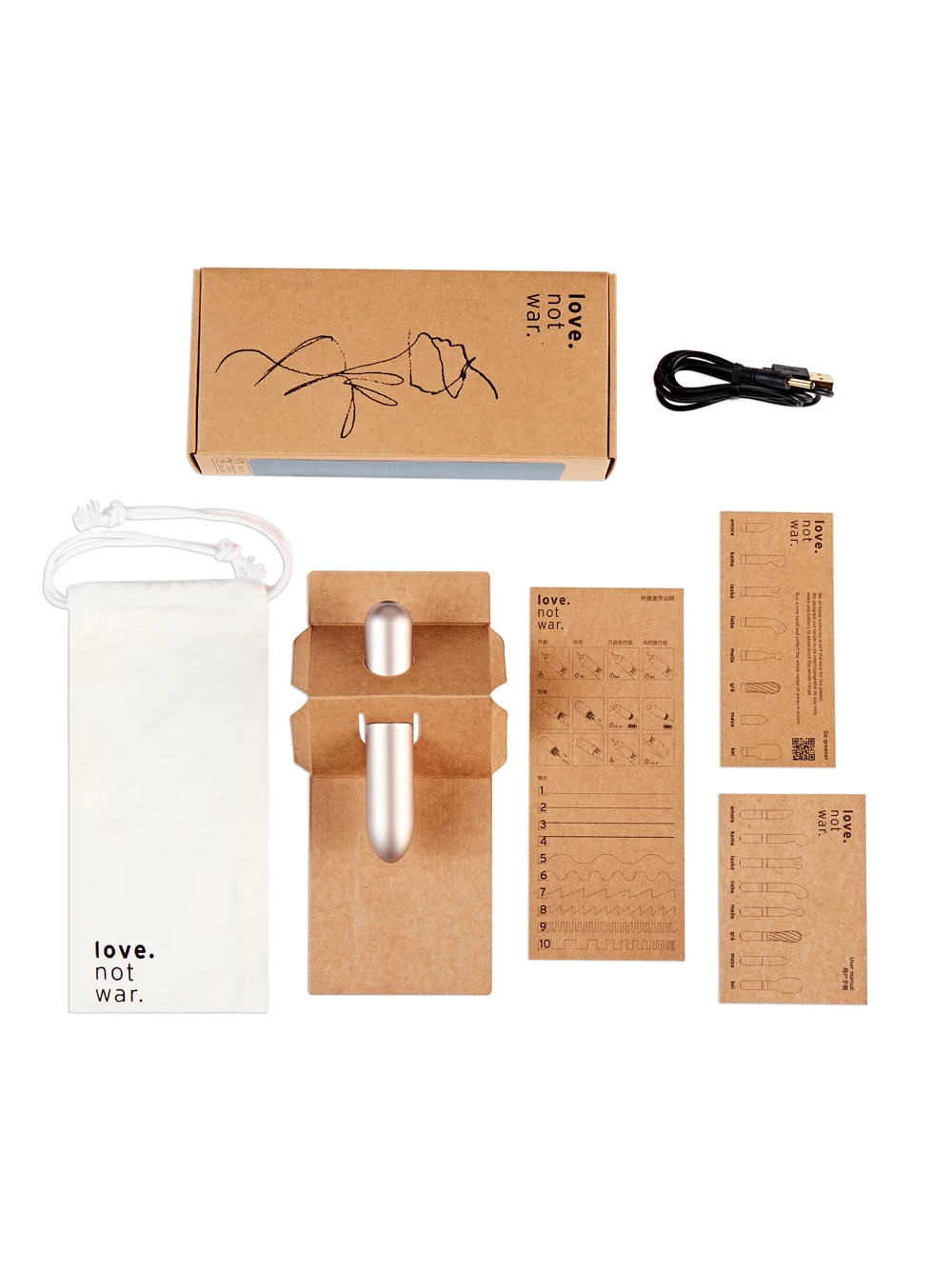 The most classic shaped of the Love Not War line, Maya is anything but ordinary. This sexy bullet vibe packs strong rumbling vibrations into a small package that is made of 99% recycled aluminum. Soft to the touch, the brushed aluminum of Maya is perfect for temperature play. It can be heated up or cooled down with ease by submerging it into a glass of water to a desired temperature.