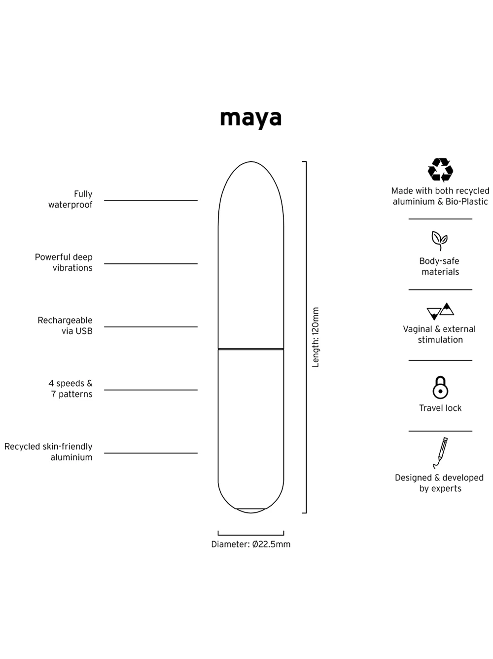 Offering deep, powerful vibrations with multiple speeds and patterns, Maya can be teased across nipples, pressed on the clitoris for intense sensation, or used for playful shallow internal stimulation.
