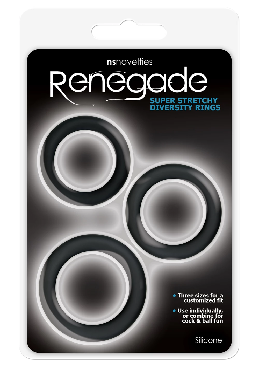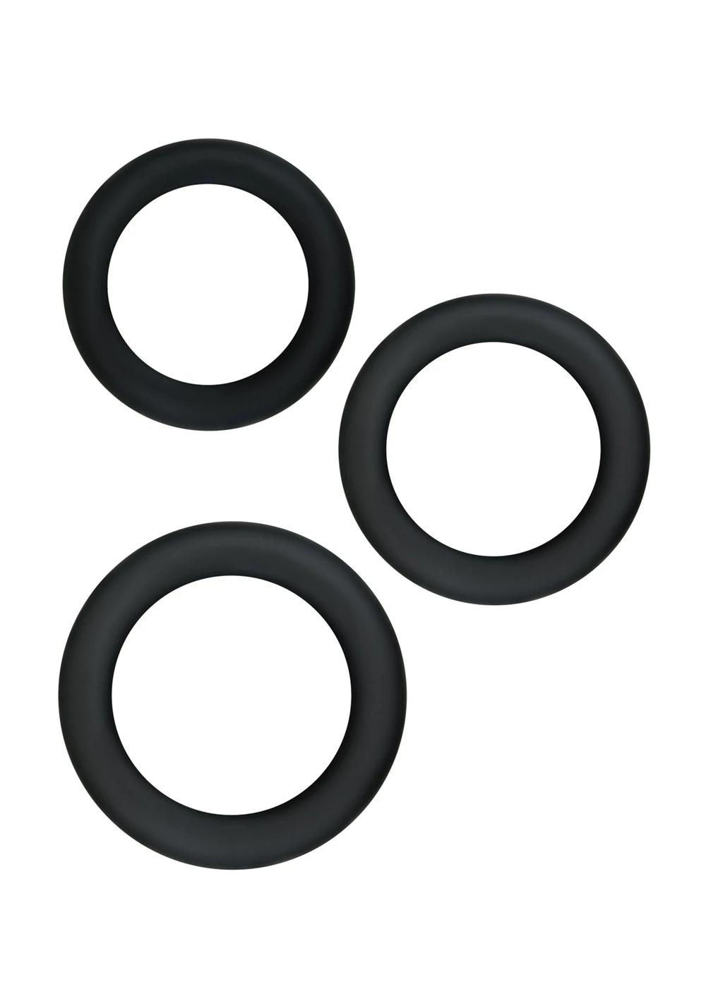 Super stretchy silicone rings in three sizes (30mm, 35mm, 40mm) provide endless combinations of restrictive enjoyment. Suitable for all lubricants. Wash with soap and water after use.